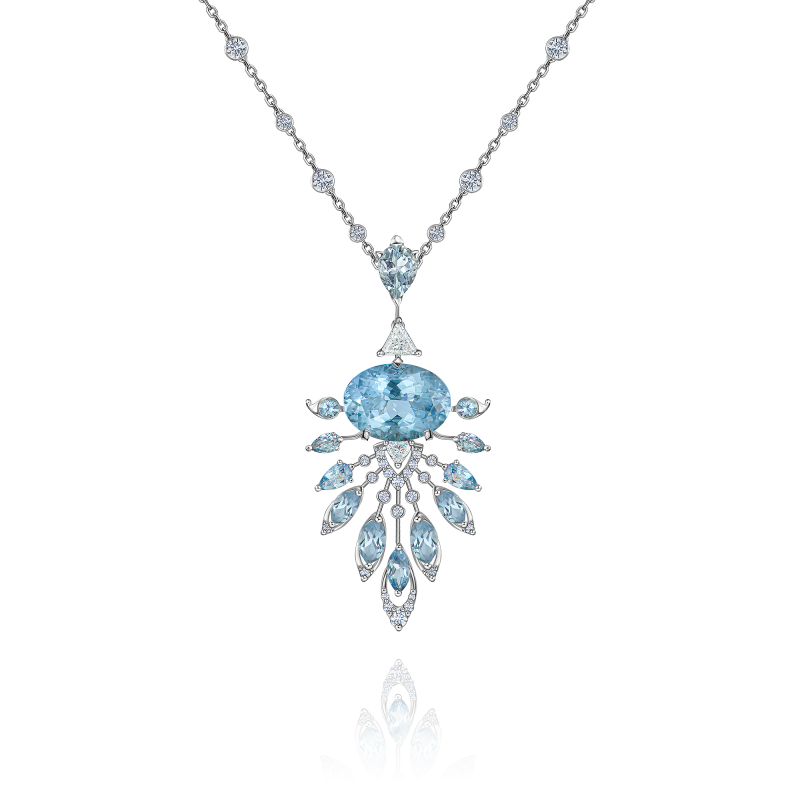 Aquamarines cut oval, pear, marquise and round cut. Trillion-cut and round-cut diamonds.